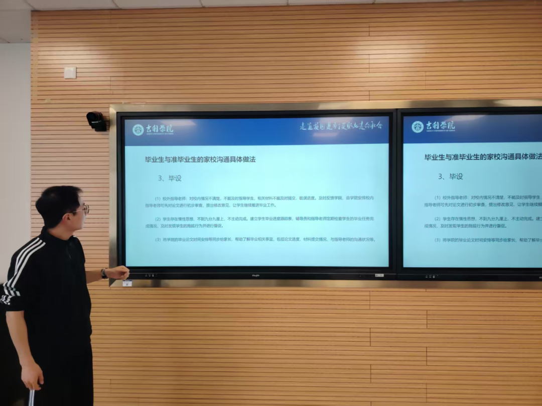 在毕业季的晨曦中,由吉利学院智能制造学院、航空航天学院、数字媒体学院三院联合发起的“家校共育·筑梦远航”毕业生交流活动中,“以爱之名”辅导员工作室充分发挥桥梁纽带作用,为百余名毕业生及家长搭建了深度沟通的平台。本次活动以“学业精进、实习护航、毕业攻坚”三大主题为核心,通过精准的数据分析、定制化的沟通方案和严格的进度跟踪,为毕业生的成长之路提供了坚实保障。