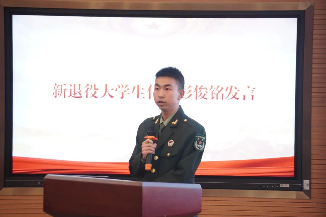 “在海拔3600米的青藏高原,每一次巡逻都是对‘寸土不让’誓言的践行。”新退役大学生代表、数字媒体学院2024级彭俊铭同学的发言,将现场气氛推向高潮。他分享了自己在西藏服役期间,克服高原反应、坚守边疆岗位的军旅经历,以及退役返校后如何将“特别能吃苦、特别能战斗、特别能忍耐、特别能团结、特别能奉献”的老西藏精神融入学习生活的感悟,真挚的讲述让在场师生深受触动,掌声此起彼伏。