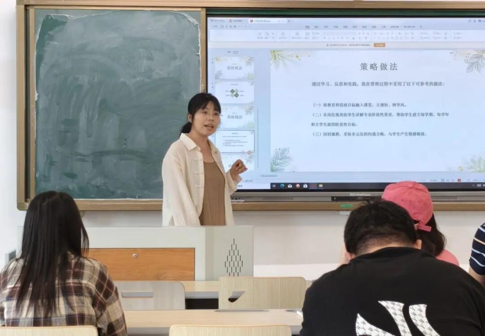 辅导员唐雪首先介绍了所负责班级的大致情况,女生偏多,男生偏少,她表示辅导员工作相对繁杂,需着重抓主线、针对个体解决问题 。然后分享学生工作要点:一是抓德育,借主题班会、谈心谈话、查寝沟通开展思政教育;二是用奖惩管理学生,表彰优秀班级和个人,惩戒迟到旷课,鼓励同学们全面发展;三是融合德、体、美与文化育人,组织学生参与运动会、爱国主义活动、科研活动,培养创新意识。