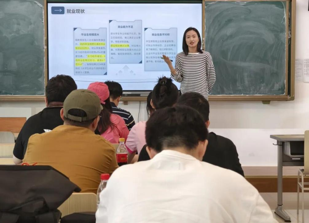 会上,多位老师分享了宝贵经验。数字媒体学院网络与新媒体专业教师申思奇强调了大学生就业焦虑及心理健康问题。她首先分析了当下就业形势,2025年高校毕业生预计达1222万人次,就业竞争压力显著增大,就业形势较为严峻。其次她通过线上线下班会、个性化帮扶等方式,助力学生缓解就业焦虑情绪,取得了良好效果。最后,她建议教师可以适当转变传统沟通方式,积极鼓励学生充分利用免费资源,同时加强自身学习,进而提升学生的就业竞争力。